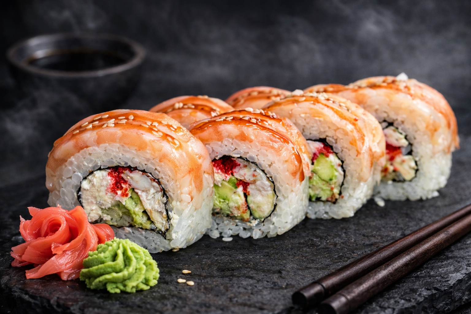 Рол доповнений ароматним соусом унагі та кунжутом, що створює ідеальний баланс свіжості, кремової текстури та легкої солодкуватої нотки.