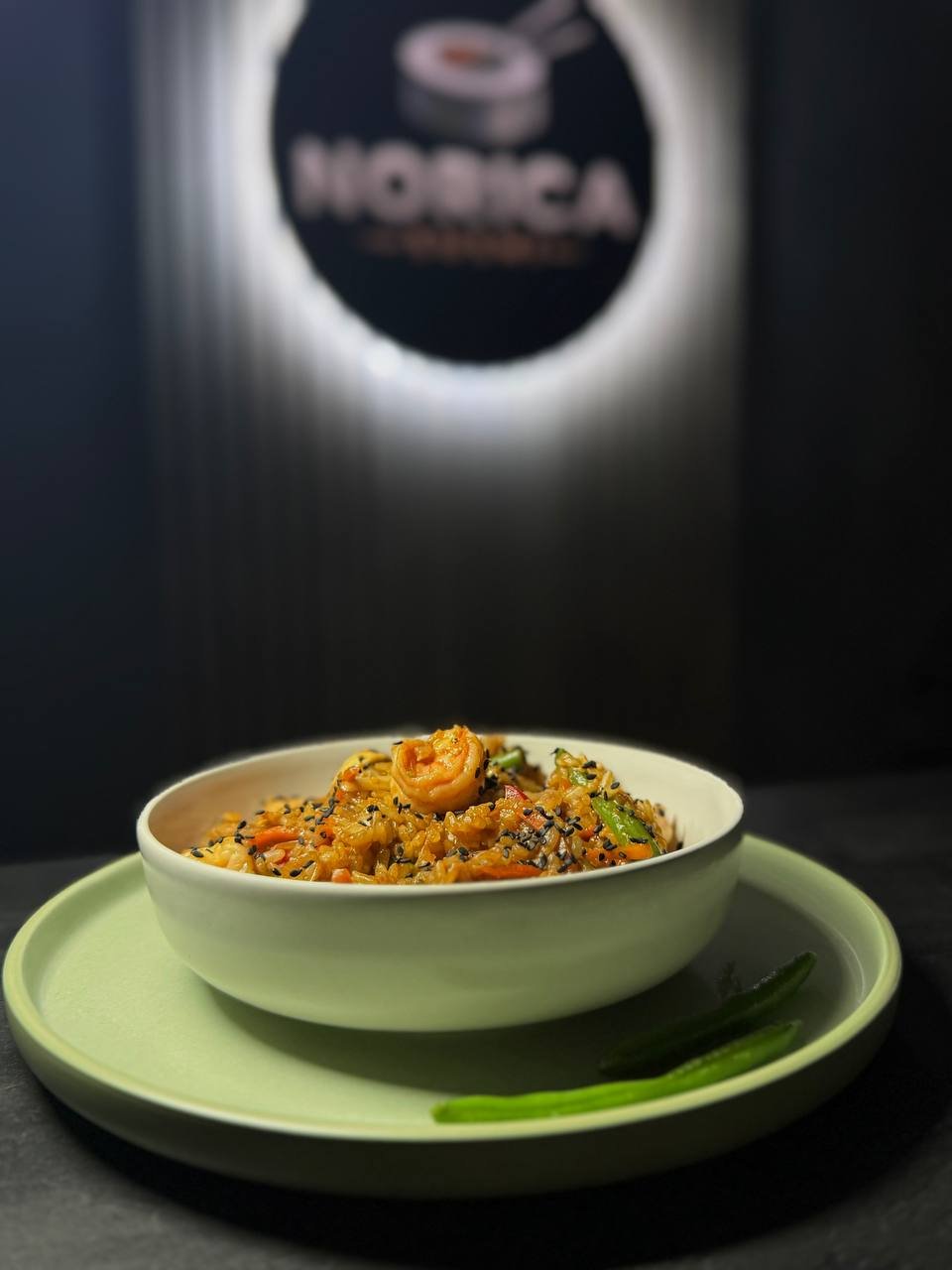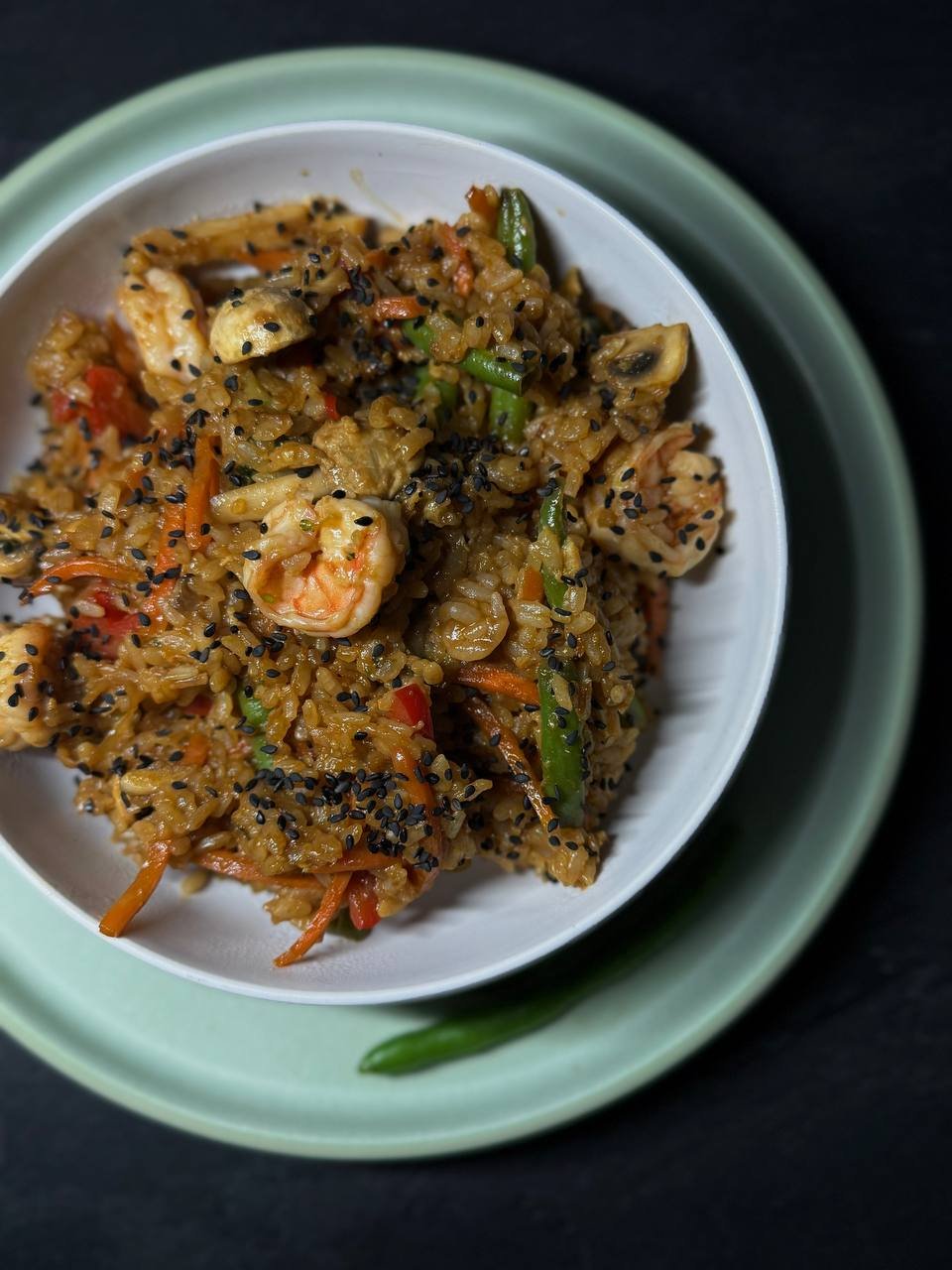 Смажений рис з тигровими креветками, морквою, цибулею, солодким перцем, броколі та стручковою квасолею, обсмажений у соєво-унагі соусі, подається із зеленою цибулею та кунжутом.