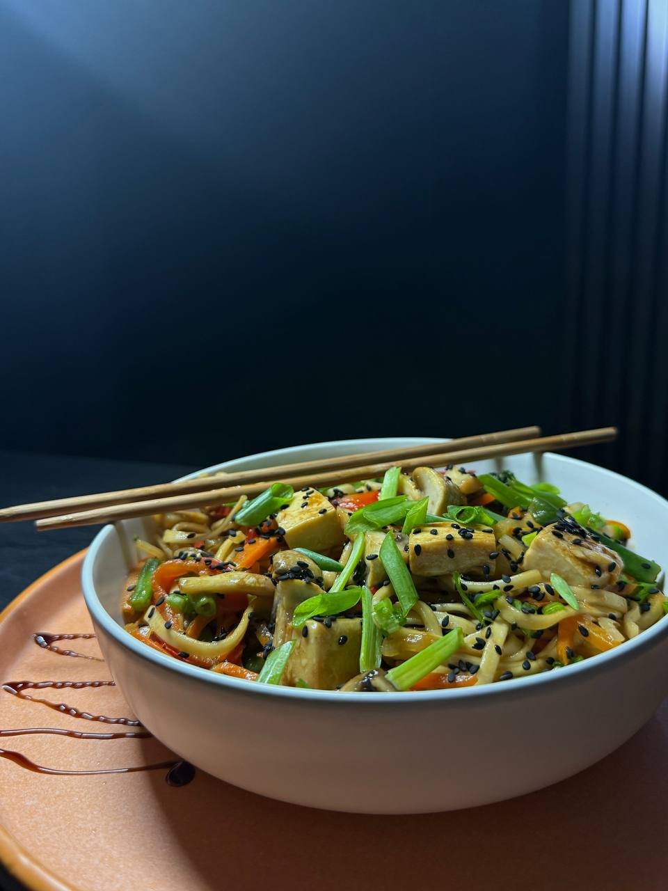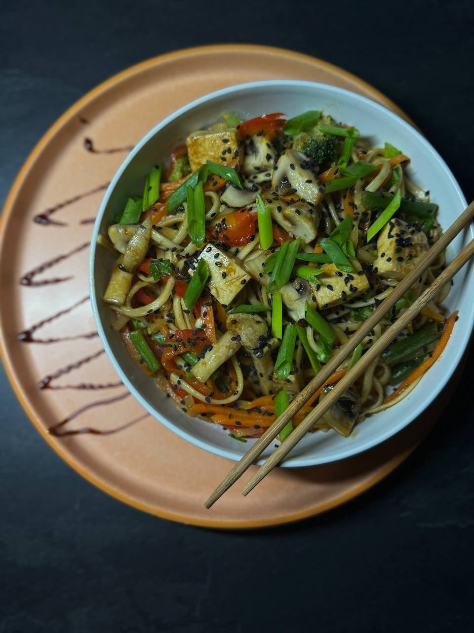 Пшенична локшина удон з печерицями та тофу, морквою, цибулею, солодким перцем, броколі та стручковою квасолею, обсмажена в соєво-унагі соусі, подається із зеленою цибулею та кунжутом.