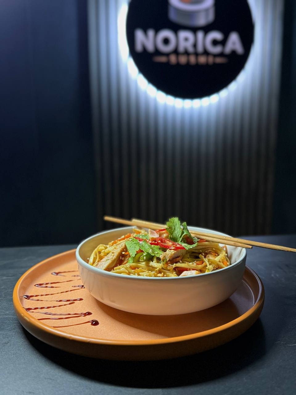 Пшенична локшина удон з курячим філе, морквою, цибулею, солодким перцем, броколі та стручковою квасолею, обсмажена в соєво-унагі соусі, подається із зеленою цибулею та кунжутом.
