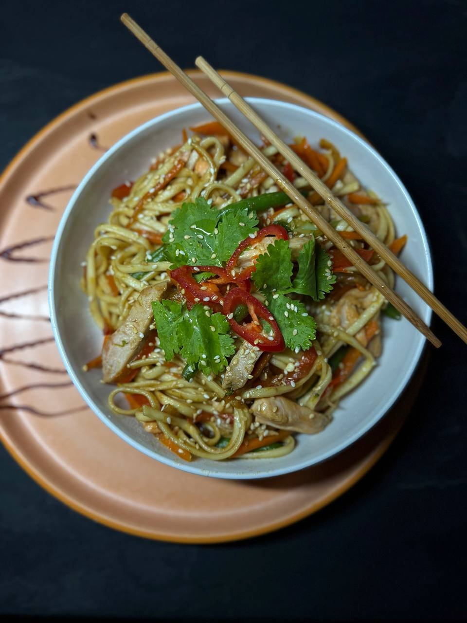 Пшенична локшина удон з лососем і тунцем, морквою, цибулею, солодким перцем, броколі та стручковою квасолею, обсмажена в соєво-унагі соусі, подається із зеленою цибулею та кунжутом.