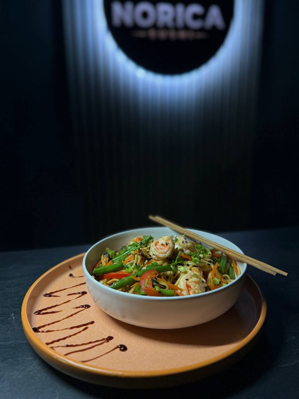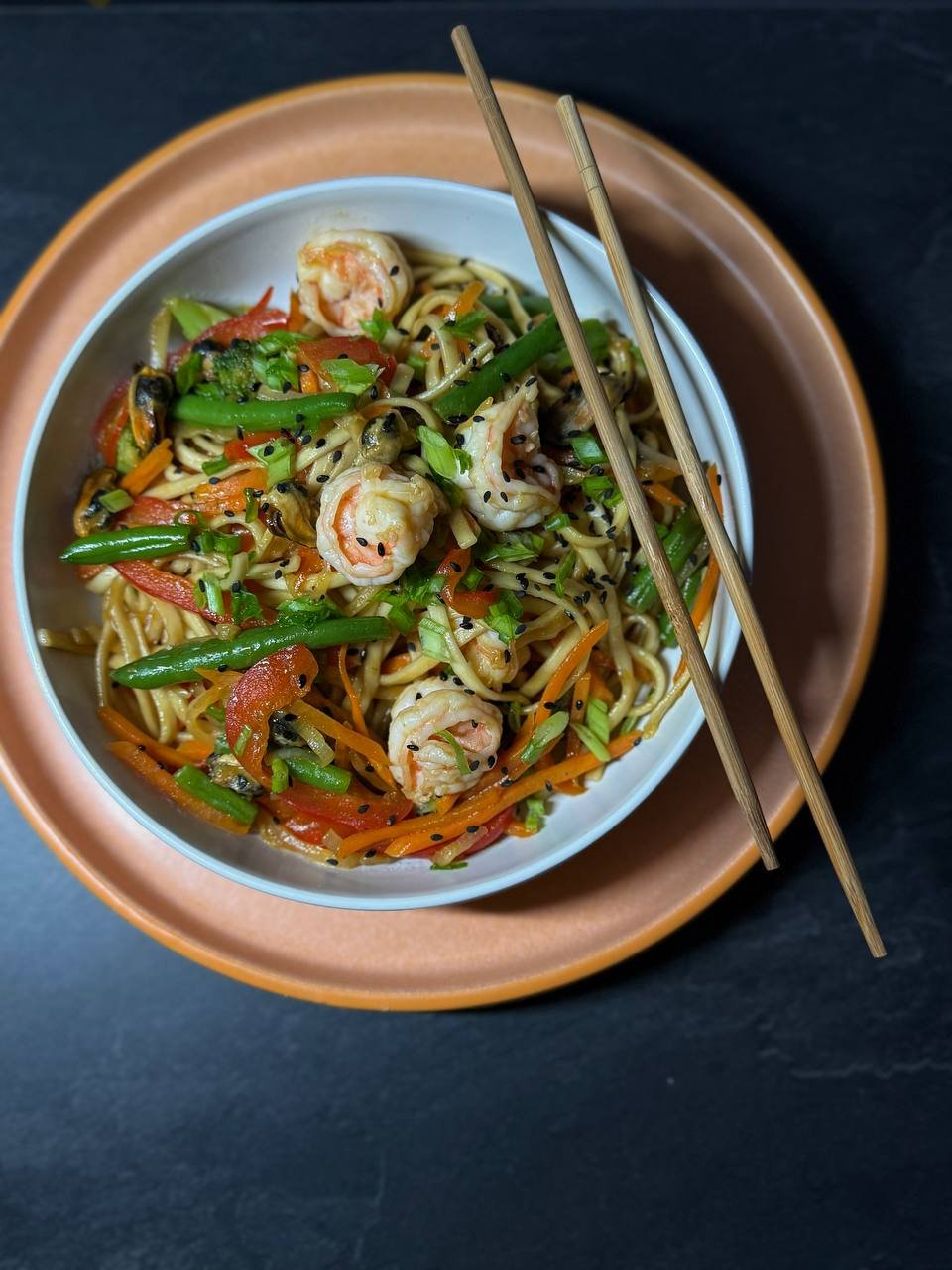 Пшенична локшина удон з креветками, бейбі восьменіг , морквою, цибулею, солодким перцем, броколі та стручковою квасолею, обсмажена в соєво-унагі соусі, подається з зеленою цибулею та кунжутом.