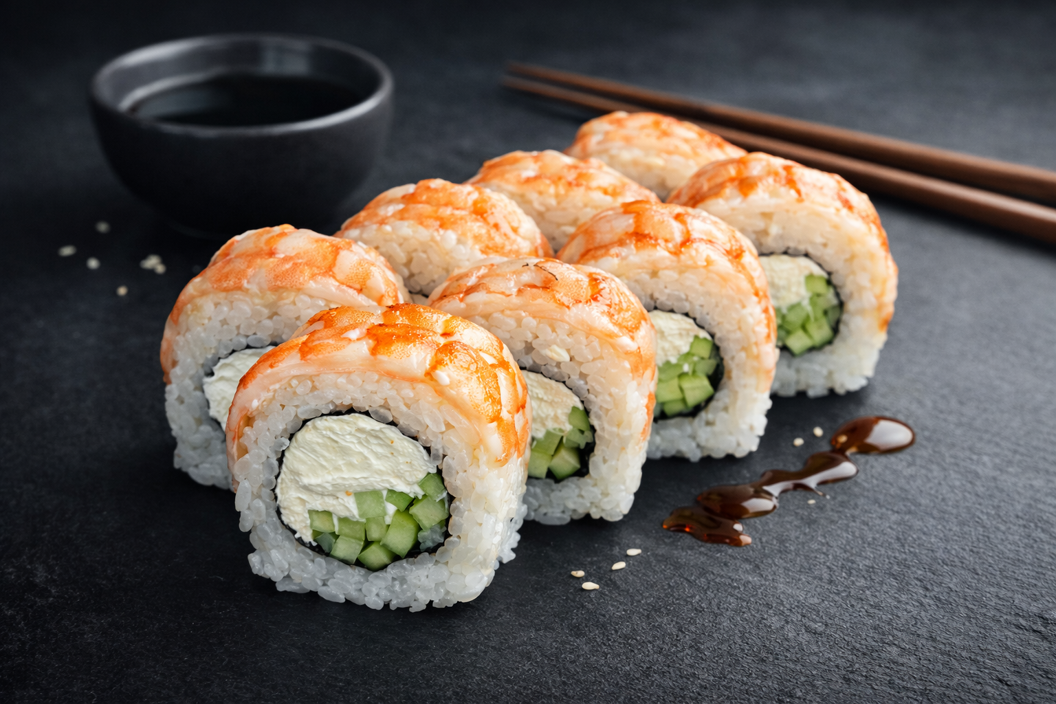 Ніжний крем-сир, свіжий огірок та соковита тигрова креветка зверху.